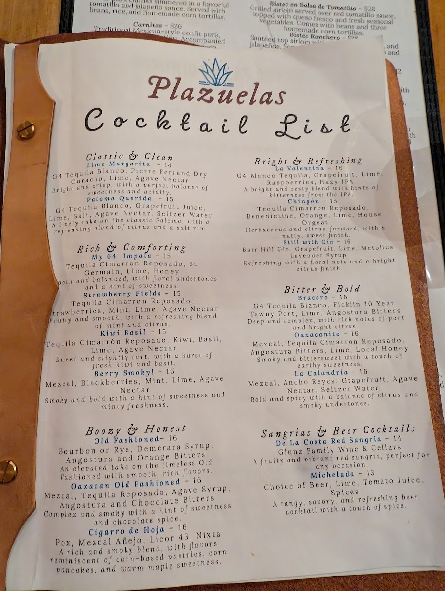 The menu at Plazuelas Mexican Restaurant offers a variety of traditional Mexican dishes alongside a selection of beverages from the bar. The food options are organized into appetizers, main dishes, sides, and desserts, providing a comprehensive representation of Mexican cuisine.