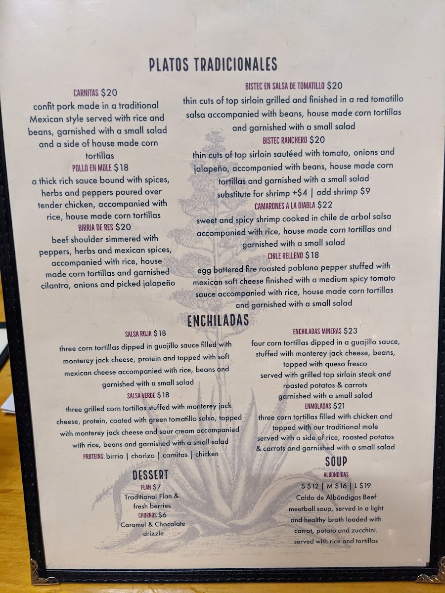 Desserts include traditional Mexican sweets such as flan and churros.